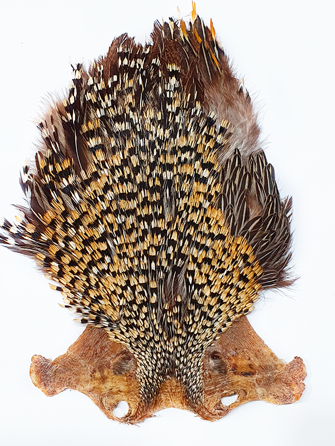 Cuero de Jungle Cock. Buen promedio de plumas en tamaño mediano. Calidad para atado de moscas para pesca. La imagen corresponde al cuero que está a la venta.