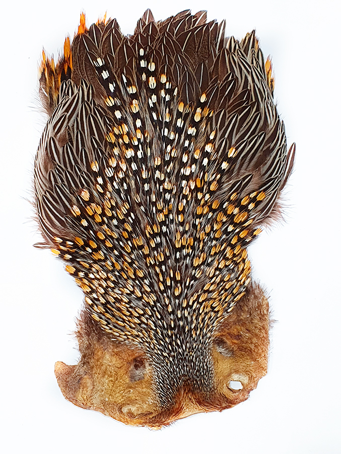 Cuero de Jungle Cock. Buen promedio de plumas en tamaño mediano. Calidad para atado de moscas para pesca. La imagen corresponde al cuero que está a la venta.